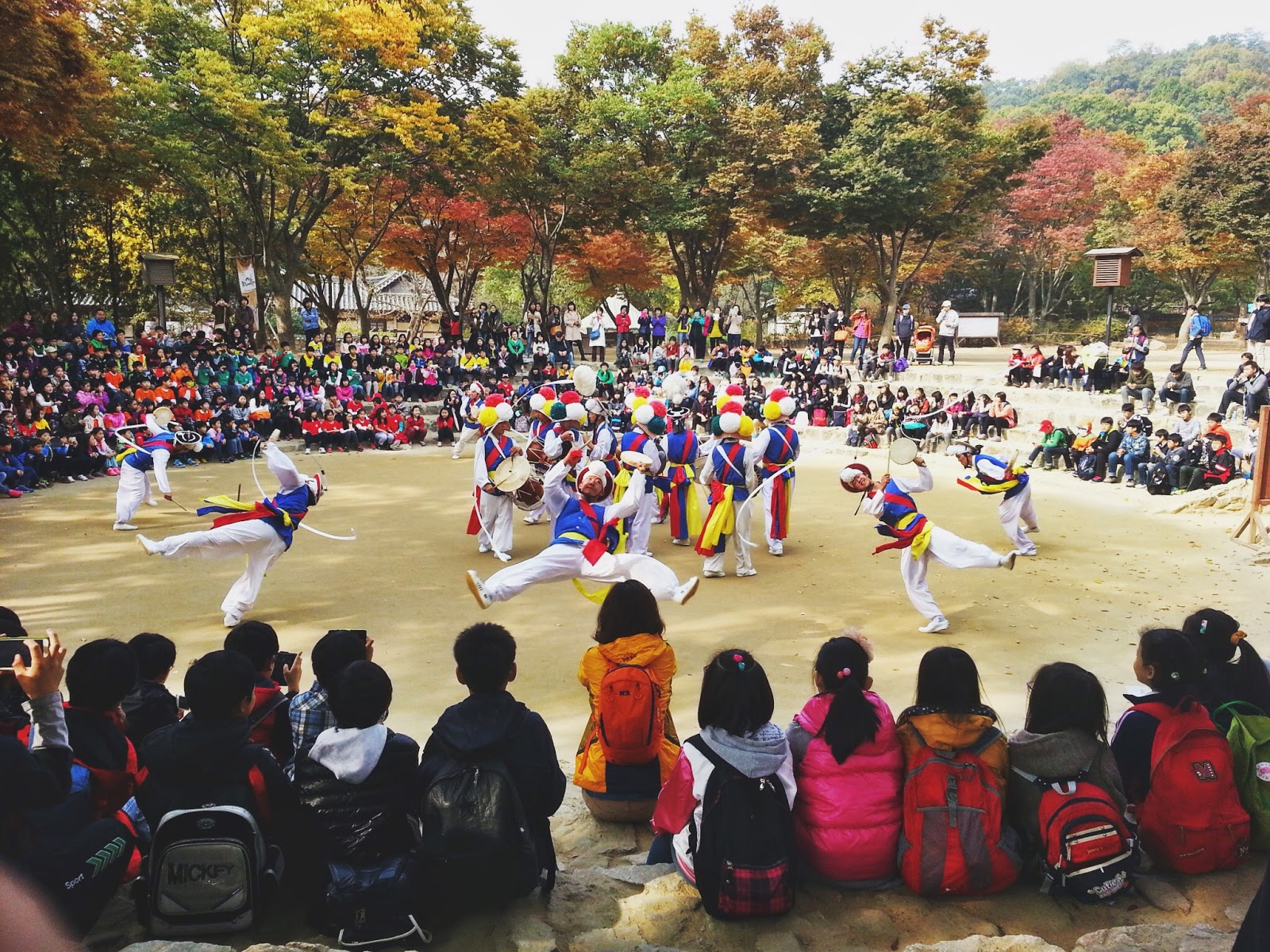 Selanjutnya kami menuju area pertunjukan traditional Korea yang bernuansa akrobatik. Keren banget penari-penari itu berputar-putar akrobatik sambil membuat lingkaran besar dari pita yang tersambung di topinya. Perhatikan penontonnya yang kebanyakan anak-anak SD di foto ini deh, hebat ya, dari kecil sudah dikenalkan dengan budaya Korea, nggak heran kalau mereka bangga sama budayanya.