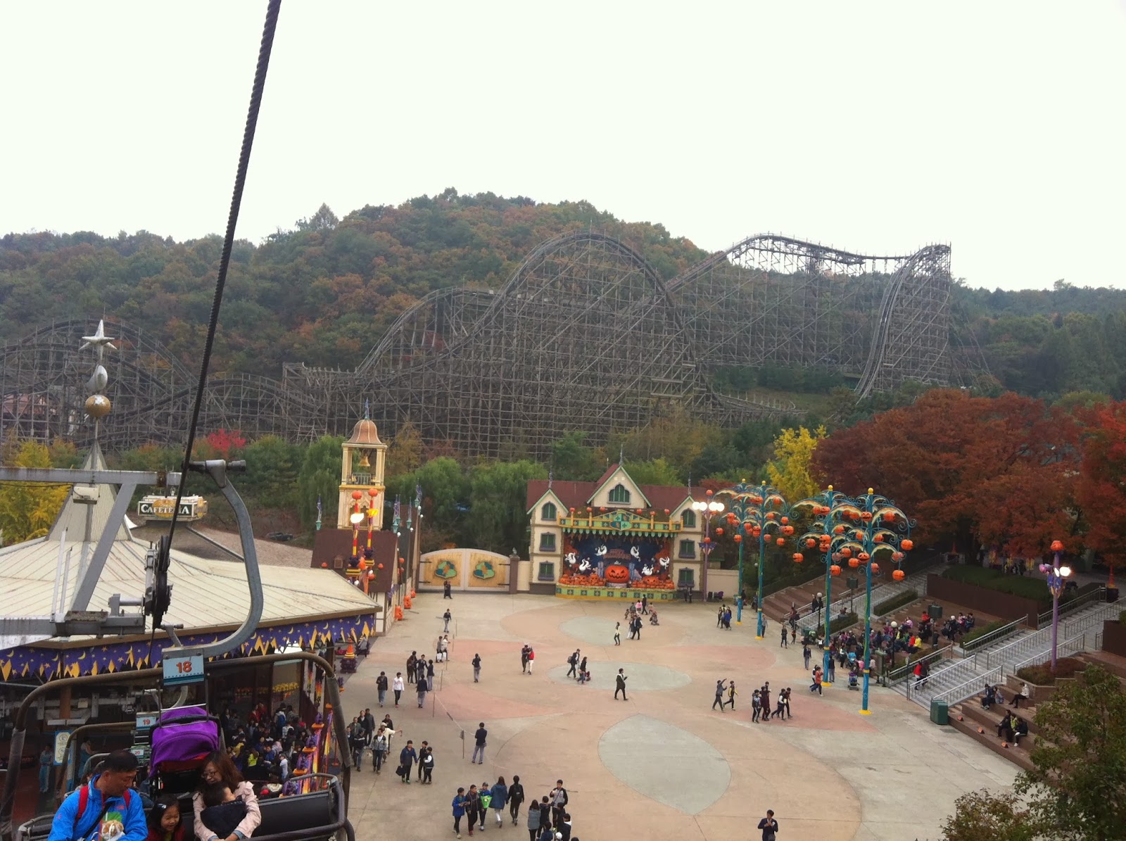 That roller coaster, which its colour in the picture blends with the trees behind lol, is the first wooden roller coaster and the largest in Korea. It is the 6th longest wooden coaster in the world at 1,779 m long as well as the steepest, with the first drop inclined at 77 degrees, jadi pas meluncur ke bawah dengan kemiringan 77 derajat itu rasanyaaaaa….kalian musti coba sendiri kalo ke Korea! 🙂